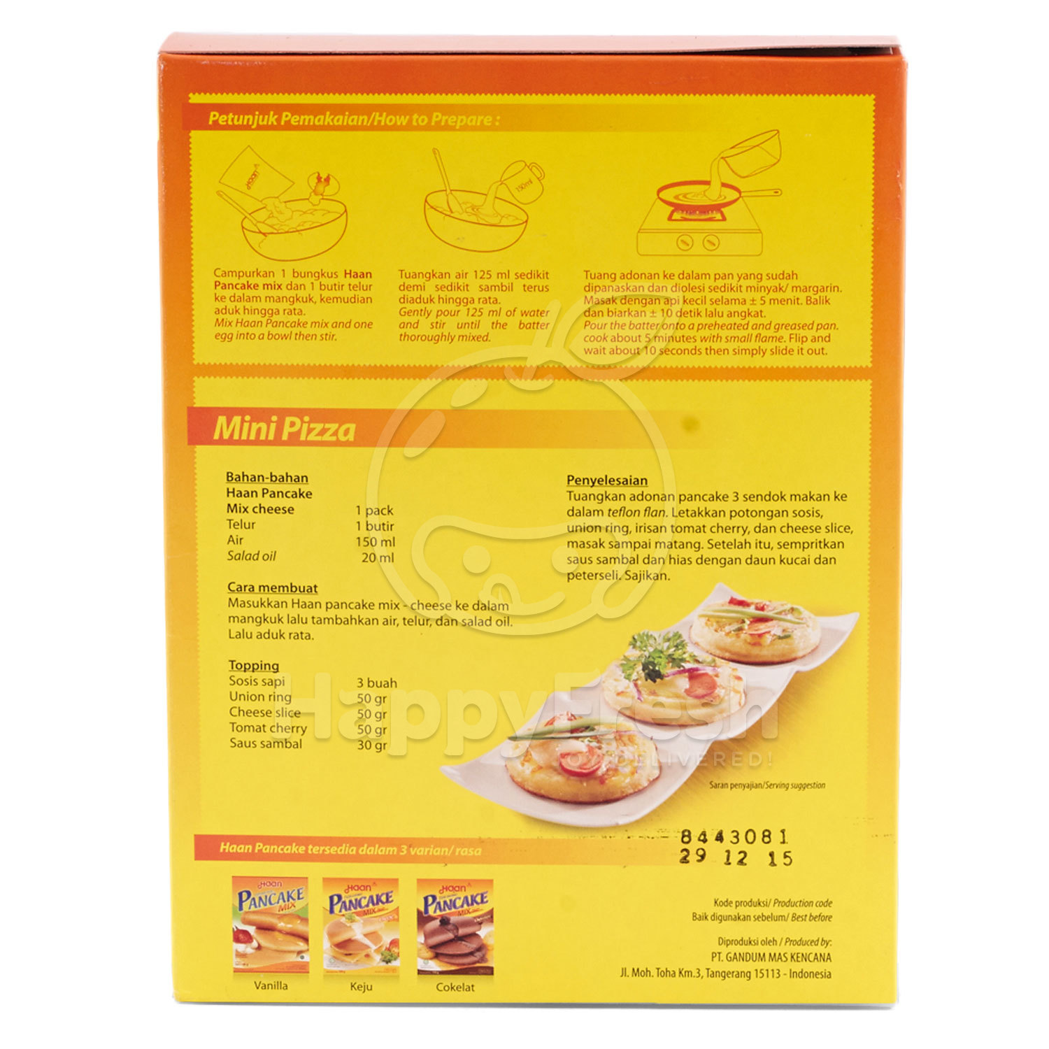Sekarang bikin pancake jadi lebih mudah dan gampang dengan memakai tepung Haan Pancake Mix Cheese. Harap dicatat bahwa beberapa makanan mungkin tidak cocok untuk beberapa orang dan Anda disarankan untuk mencari nasehat dari ahli gizi sebelum memulai program pengurangan berat badan atau diet. Pancake Haan butuh tambahan 2 buah telur.